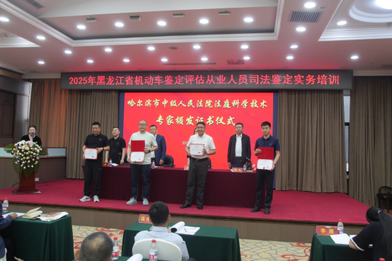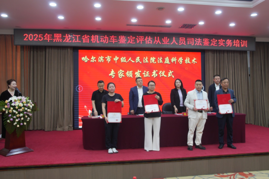 哈尔滨市法院等相关领导为“哈尔滨市中级人民法院机动车鉴定评估类法庭科学技术法院专家”颁发专家聘书