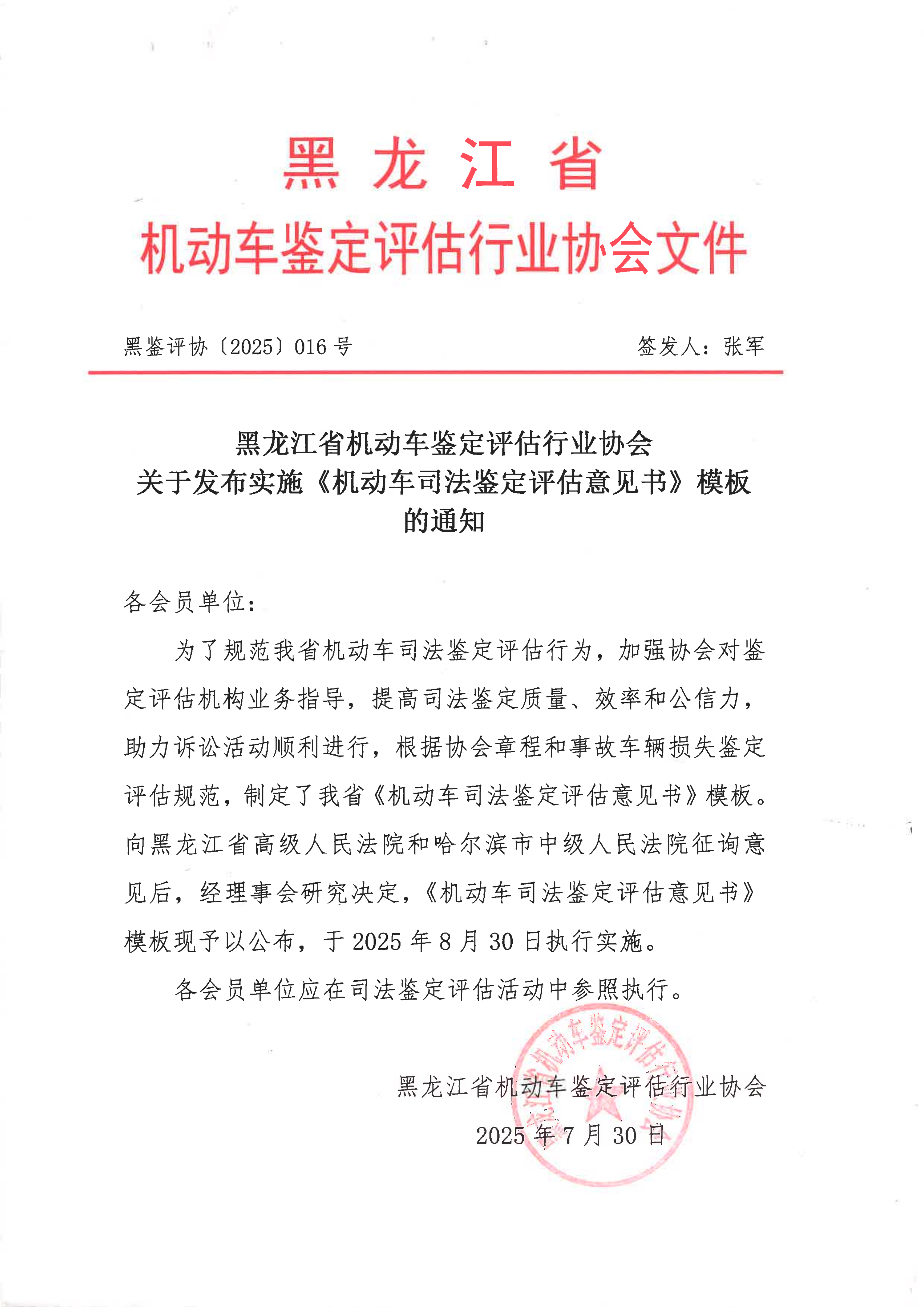 黑龙江省机动车鉴定评估行业协会 关于发布实施《机动车司法鉴定评估意见书》模板 的通知