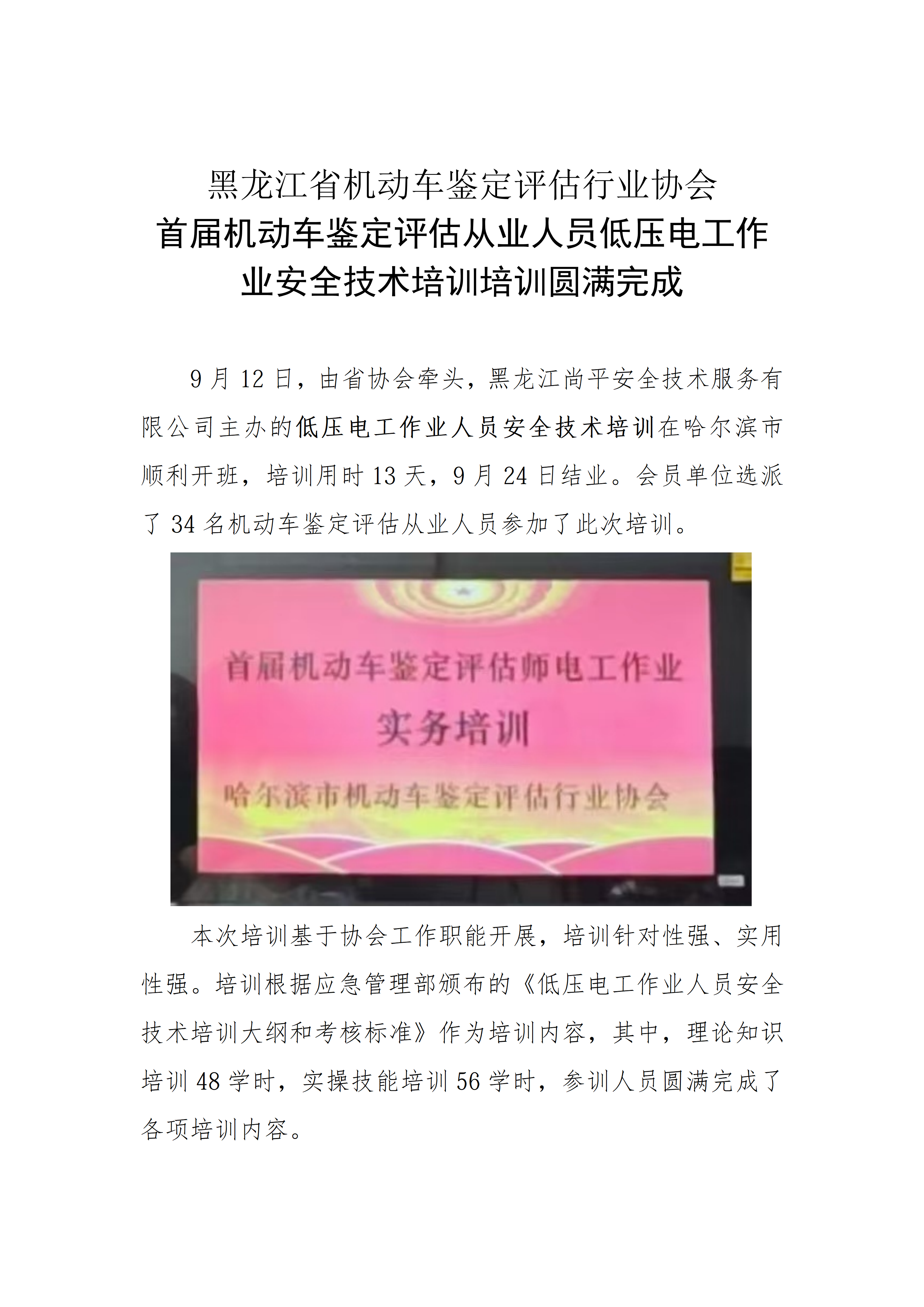 黑龙江省机动车鉴定评估行业协会 首届机动车鉴定评估从业人员低压电工 作业安全技术培训圆满完成