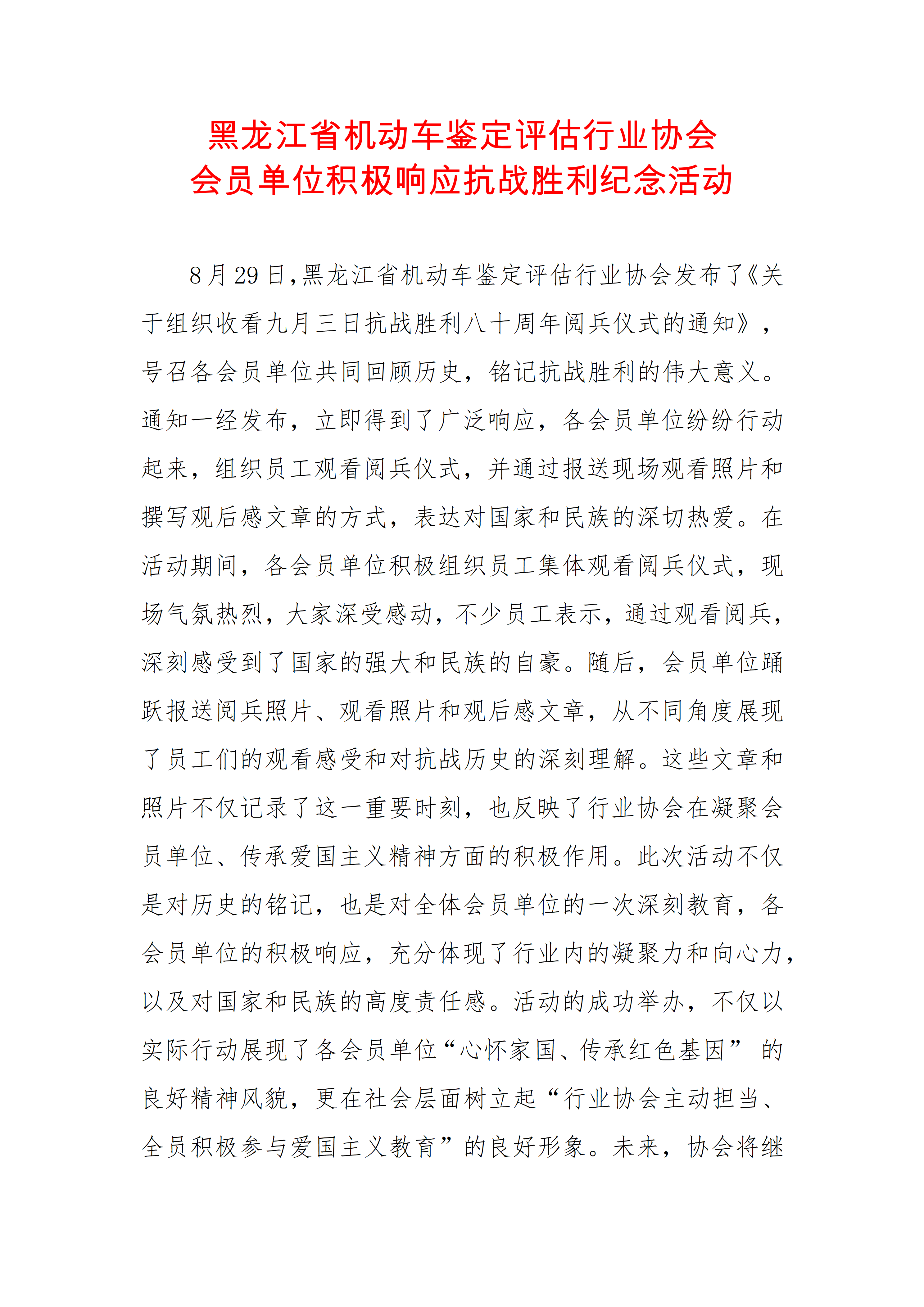 黑龙江省机动车鉴定评估行业协会 会员单位积极响应抗战胜利纪念活动